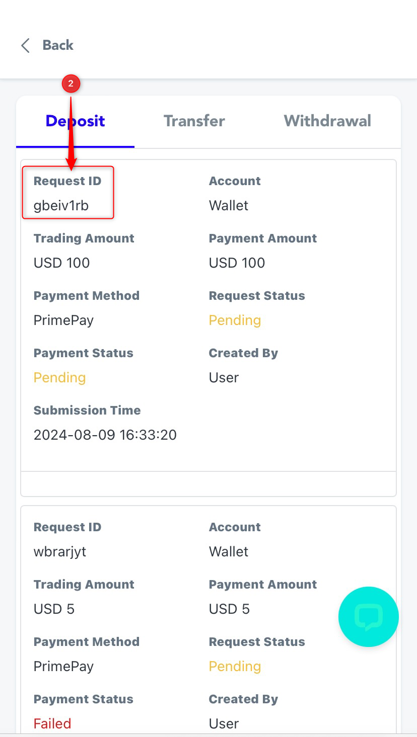3) Select the “Deposit” tab to display the list of deposit applications. The application ID displayed within the relevant deposit transaction item will be the deposit transaction number.